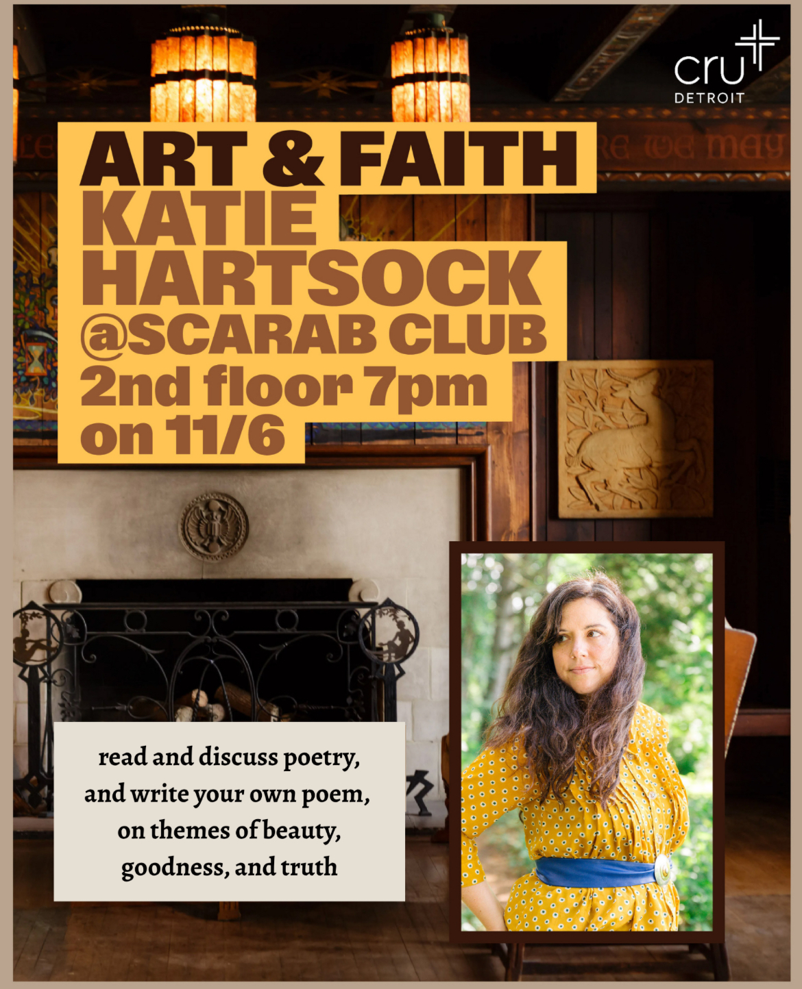 The Scarab Club, just down the block from the DIA, is one of Detroit’s most iconic gems, founded and built by artists in the 1920s. There’s a smalI parking next to the building, and then street parking if the lot is full. The event is hosted by Detroit CRU, a a multi-ethnic Christian campus ministry working with many universities in southeast Detroit.